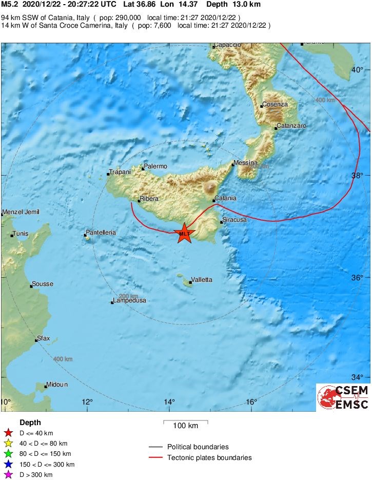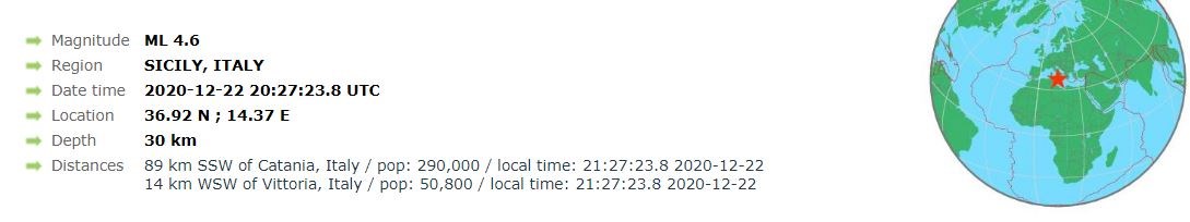Ισχυρή σεισμική δόνηση 4,6 βαθμών της κλίμακας Ρίχτερ σημειώθηκε πριν από λίγα λεπτά στη Σικελία. Σύμφωνα με την αναθεωρημένη λύση του Ευρωμεσογειακού Σεισμολογικού Κέντρου, ο σεισμός είχε εστιακό βάθος 30 χλμ. και το επίκεντρο του εντοπίζεται στα 89 χλμ. νότιο-νοτιοδυτικά της Κατάνια.