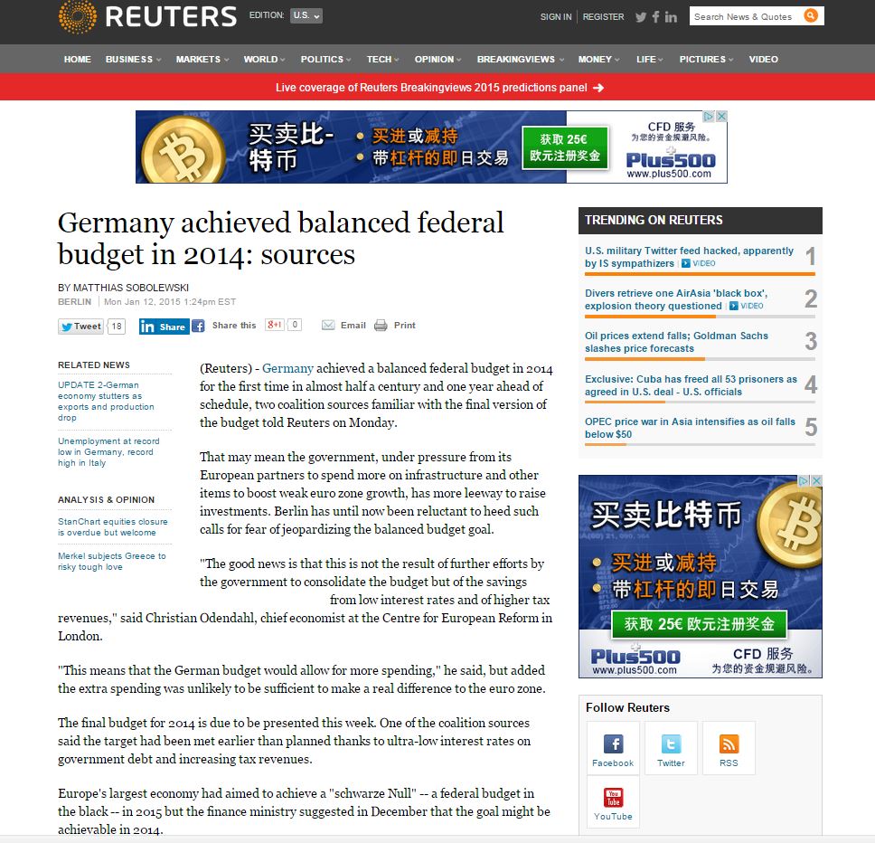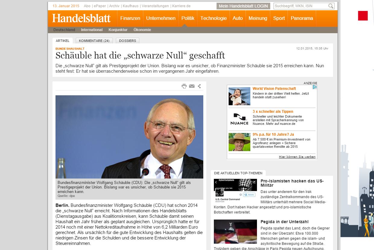 Την ίδια πληροφορία, περί της επίτευξης ισοσκελισμένου προϋπολογισμού το 2014, δημοσίευσε νωρίτερα η γερμανική οικονομική εφημερίδα Handelsblatt, επικαλούμενη πηγές προσκείμενες στον κυβερνητικό συνασπισμό.