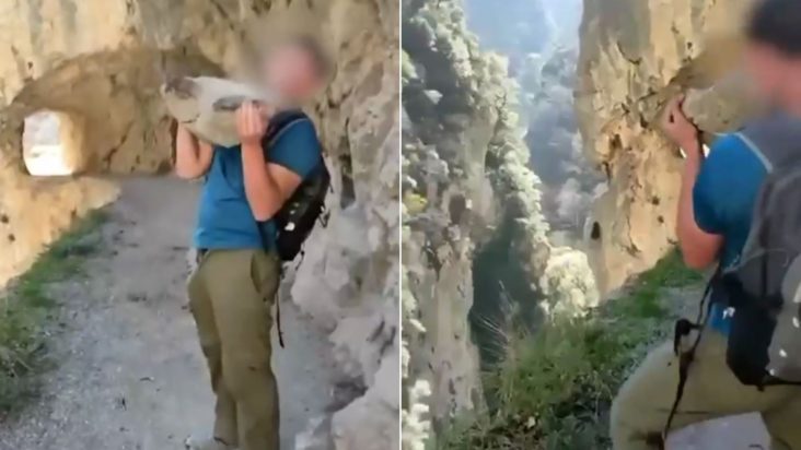 Ένα βίντεο που κυκλοφόρησε στα μέσα κοινωνικής δικτύωσης καταγράφει τον τουρίστα, ντυμένο με πεζοπορικό εξοπλισμό, να πετάει έναν μεγάλο βράχο από το χείλος του βουνού κατά μήκος του μονοπατιού Cares Trail, το οποίο διασχίζουν κάθε χρόνο περίπου 300.000 επισκέπτες.