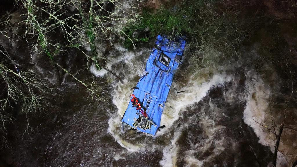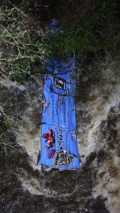 «Μπορεί να υπάρχουν κι άλλοι άνθρωποι στο εσωτερικό του λεωφορείου», διευκρινίζουν οι υπηρεσίες άμεσης δράσης, οι οποίες δημοσιοποίησαν στα μέσα κοινωνικής δικτύωσης μια φωτογραφία από ψηλά του λεωφορείου να έχει πέσει σε ορμητικά νερά.