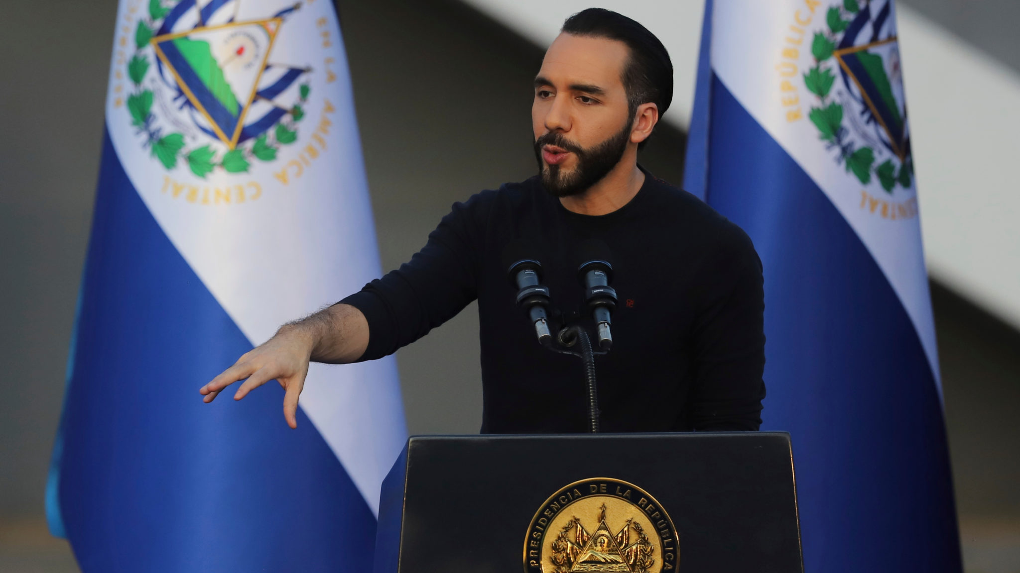 FILE - El Salvador's President Nayib Bukele gives a speech during the inauguration of an industrial data center in Ciudad Arce, El Salvador, July 16, 2024. (AP Photo/Salvador Melendez, File)