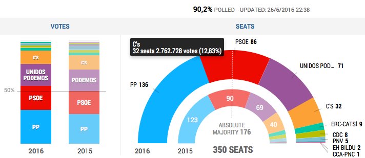 Με καταμετρημένο το 90% των ψήφων το Λαϊκό Κόμμα του Ραχόι συγκεντρώνει 136 έδρες, το Σοσιαλιστικό κόμμα 86, οι Podemos 71 και οι Ciudadanos 32.