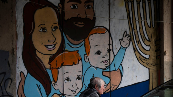 Πάνω από την εξέδρα, αναρτήθηκε πανό που παρουσίαζε τον Ισραηλινό πρωθυπουργό Μπενιαμίν Νετανιάχου σαν βρικόλακα.