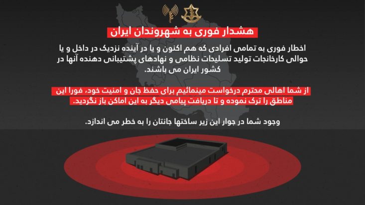«Όλα τα άτομα που βρίσκονται ή αναμένεται να βρίσκονται σε ή γύρω από εγκαταστάσεις κατασκευής στρατιωτικών όπλων και τα υποστηρικτικά τους ιδρύματα πρέπει να εκκενώσουν αμέσως αυτές τις περιοχές και να μην επιστρέψουν μέχρι νεωτέρας», λέει ο αραβόφωνος εκπρόσωπος των Ισραηλινών Αμυντικών Δυνάμεων, Συνταγματάρχης Avichay Adraee, στο X.