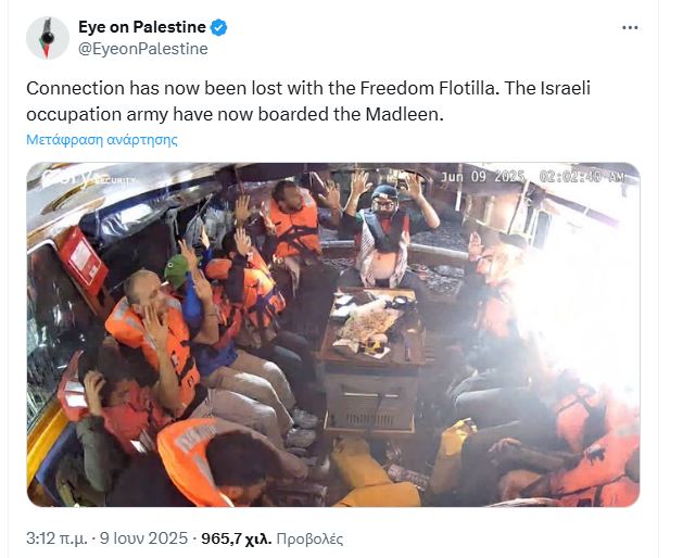 Ισραηλινοί στρατιώτες κατέλαβαν το ξημέρωμα της Δευτέρας (9/6) το υπό βρετανική σημαία ιστιοφόρο Madleen που είχε ναυλώσει ο συνασπισμός του Στολίσκου Ελευθερίας (Freedom Flotilla Coalition/FFC). Το πλοίο κατευθυνόταν προς τη Λωρίδα της Γάζας, αψηφώντας τον ναυτικό αποκλεισμό που έχει επιβάλει το Ισραήλ.