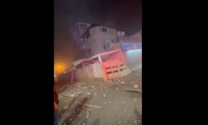 Εικόνες από την Τίρα δείχνουν ζημιές σε κτίριο που προφανώς χτυπήθηκε από την ρουκέτα.