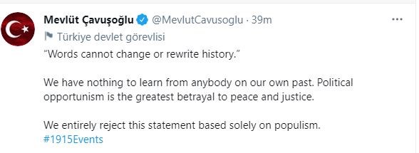 Από την πλευρά του ο Τούρκος ΥΠΕΞ Μεβλούτ Τσαβούσογλου με ανάρτησή του στο Twitter σε τουρκικά και αγγλικά σχολιάζει την ανακοίνωση Μπάιντεν επισημαίνοντας πως τα λόγια δεν αλλάζουν την ιστορία. “Τα λόγια δεν αλλάζουν ούτε ξαναγράφουν την ιστορία. Δεν έχουμε τίποτα να μάθουμε από κανέναν για το δικό μας παρελθόν. Πολιτικός οπορτουνισμός είναι η μεγαλύτερη προδοσία της ειρήνης και της δικαιοσύνης. Απορρίπτουμε εντελώς αυτήν τη δήλωση που βασίζεται αποκλειστικά στον λαϊκισμό”.