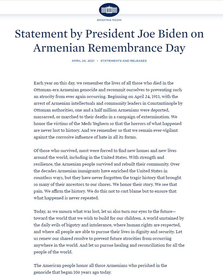 Όπως σημειώνει η ανακοίνωση του Λευκού Οίκου, «κάθε χρόνο αυτή την ημέρα, θυμόμαστε τις ζωές όλων εκείνων που πέθαναν στη γενοκτονία των Αρμενίων της Οθωμανικής εποχής και δεσμευόμαστε να αποτρέψουμε ξανά μια τέτοια βιαιότητα. Ξεκινώντας στις 24 Απριλίου 1915, με τη σύλληψη Αρμενίων διανοουμένων και ηγετών της κοινότητας στην Κωνσταντινούπολη από τις οθωμανικές αρχές, ενάμισι εκατομμύριο Αρμένιοι απελάθηκαν, σφαγιάστηκαν ή προχώρησαν σε πορείες θανάτου σε μια εκστρατεία εξόντωσης. Τιμούμε τα θύματα των Meds Yeghern (Μεγάλο Έγκλημα), έτσι ώστε οι φρικαλεότητες που συνέβησαν τότε να μην χαθούν ποτέ στην ιστορία. Και θυμόμαστε έτσι ώστε να παραμείνουμε πάντα σε εγρήγορση ενάντια στη διαβρωτική επίδραση του μίσους σε όλες τις μορφές του».