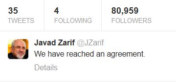 Από την πλευρά του ο ιρανός υπουργός Εξωτερικών, Μοχάμεντ Ζαρίφ, ανέφερε λιτά μέσω του προσωπικού λογαριασμού στο Twitter ότι “έχουμε καταλήξει σε συμφωνία”. Οι διαπραγματεύσεις στη Γενεύη αφορούσαν τον περιορισμό του πυρηνικού προγράμματος του Ιράν σε αντάλλαγμα ελαφρύνσεις στις οικονομικές κυρώσεις που έχει επιβάλει η Δύση κατά της Τεχεράνης.