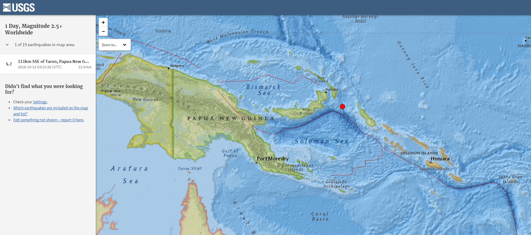 Σεισμική δόνηση μεγέθους 5,7 βαθμών έγινε σε απόσταση 182 χιλιομέτρων νοτιοανατολικά της πόλης Ραμπάουλ, στην Παπούα Νέα Γουινέα, σύμφωνα με το Γεωλογικό Ινστιτούτο των ΗΠΑ.