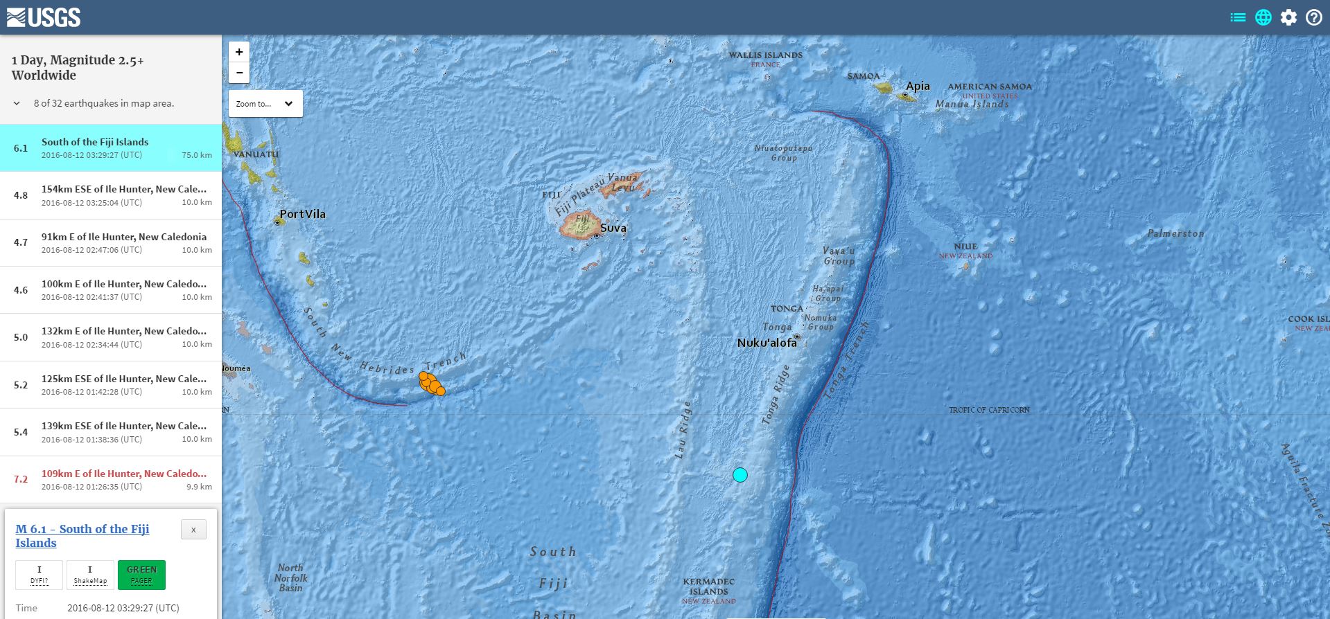 Ισχυρός σεισμός μεγέθους 6,1 βαθμών της κλίμακας Ρίχτερ έγινε σε απόσταση 460 χλμ., νοτιοδυτικά του νησιού-κράτους Τόνγκα, στο νότιο Ειρηνικό, σήμερα το πρωί, σύμφωνα με το Γεωλογικό Ινστιτούτο των ΗΠΑ.