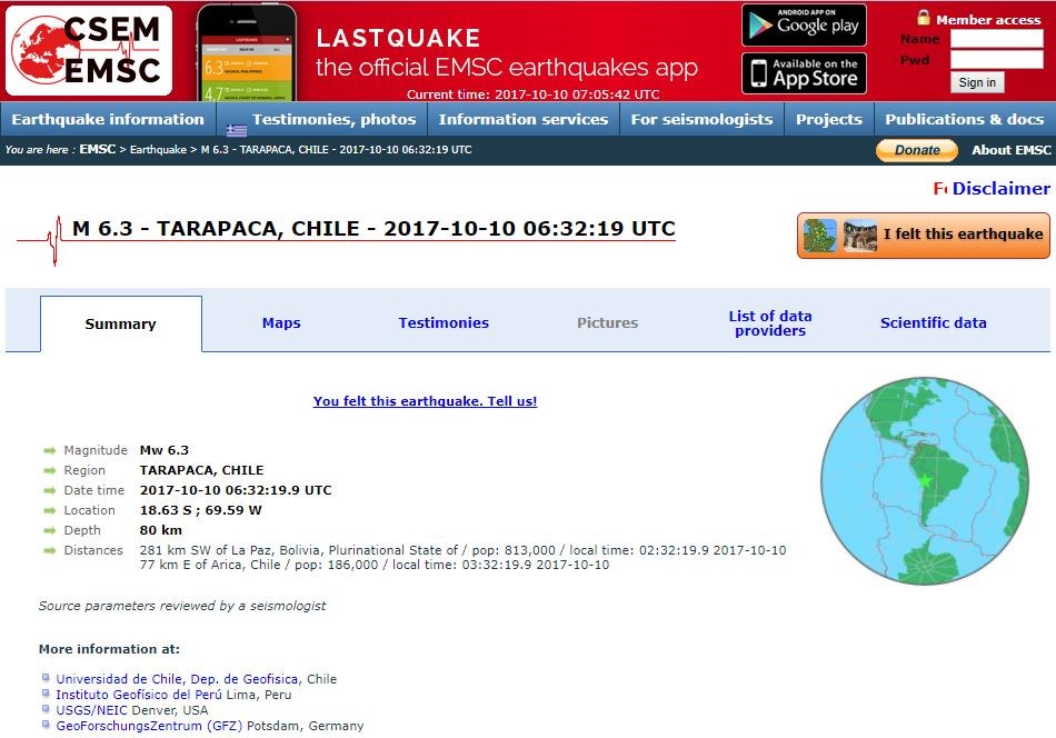 Ισχυρός σεισμός 6,3 Ρίχτερ εκδηλώθηκε στη βόρεια Χιλή, σύμφωνα με τις αυτόματες λύσεις του Ευρωμεσογειακού Ινστιτούτου και του Αμερικανικού Γεωλογικού Ινστιτούτου.
