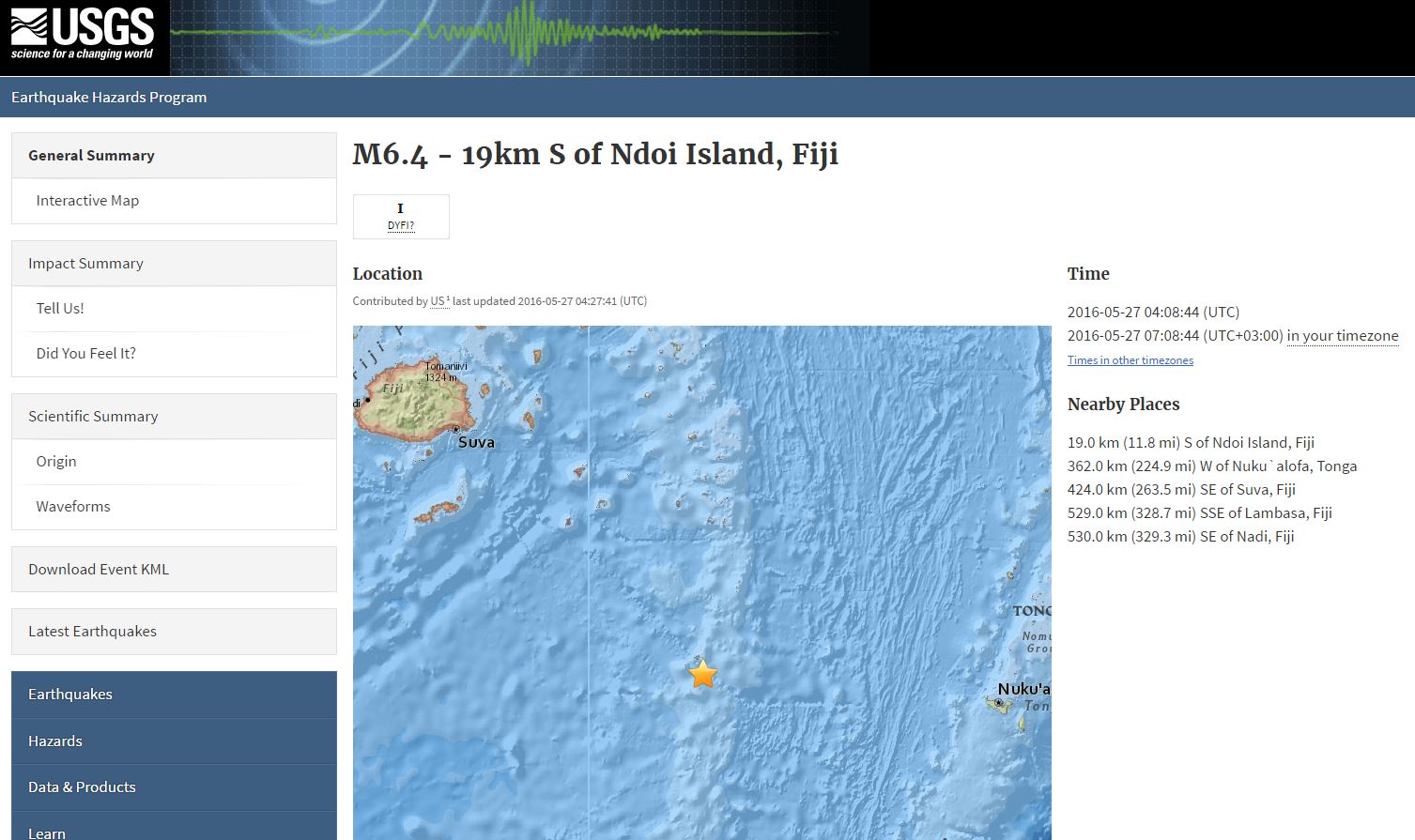 Ισχυρός σεισμός μεγέθους 6,4 βαθμών της κλίμακας Ρίχτερ έγινε ανοιχτά των νησιών Τόνγκα, στο Νότιο Ειρηνικό, σύμφωνα με το Γεωλογικό Ινστιτούτο των ΗΠΑ.