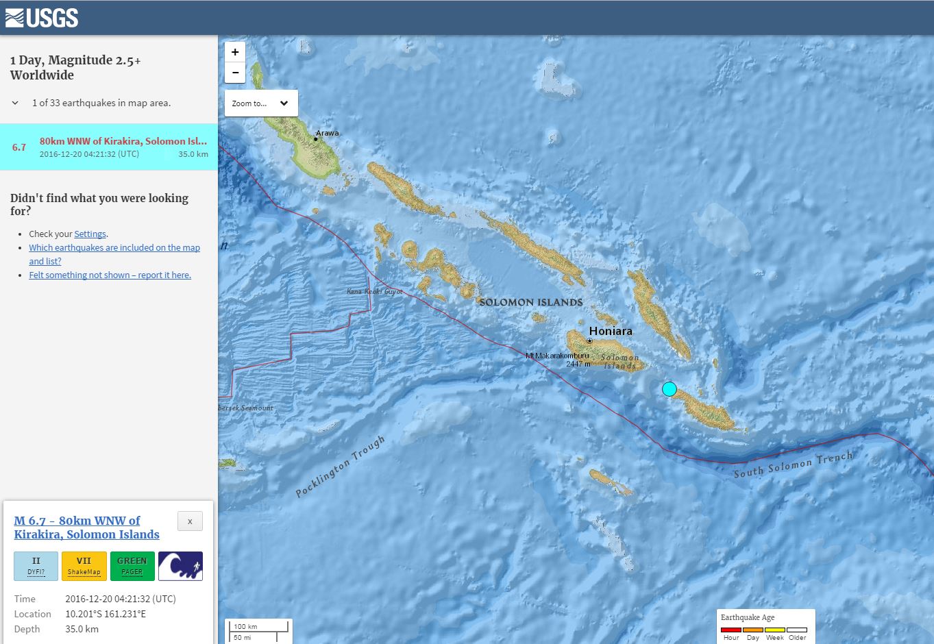 Σεισμική δόνηση μεγέθους 6,7 Ρίχτερ έγινε σήμερα στα Νησιά του Σολομώντα, σύμφωνα με το Γεωλογικό Ινστιτούτο των ΗΠΑ.