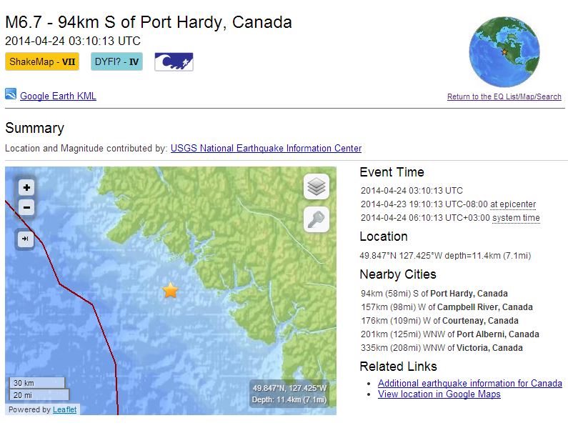 Το επίκεντρο εντοπίζεται 94 χλμ. από το Port Hardy, ενώ το εστιακό βάθος ήταν 11,4 χλμ.