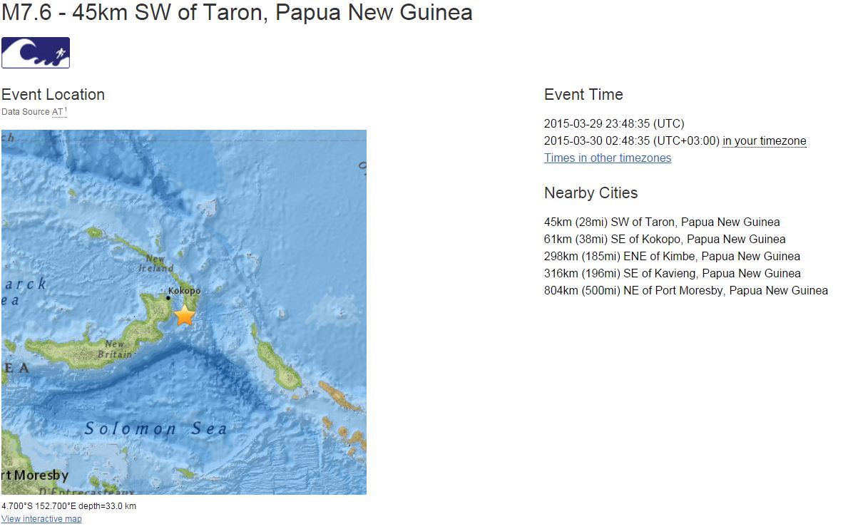 Ισχυρός σεισμός μεγέθους 7,6 βαθμών της κλίμακας Ρίχτερ σημειώθηκε πριν από λίγα λεπτά στη θαλάσσια περιοχή ανοιχτά της Παπούα Νέας Γουινέας.