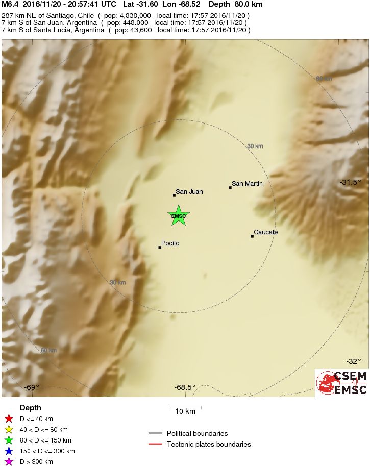 Συγκεκριμένα, η δόνηση ήταν μεγέθους 6,4 βαθμών της κλίμακας Ρίχτερ σύμφωνα με το EMSC σε εστιακό βάθος 80 χιλιομέτρων. Όσο για το επίκεντρο του σεισμού, εντοπιζόταν στο 7 χιλιόμετρα νότια του Σαν Χουάν και της Σάντα Λουκία της Αργεντινής.