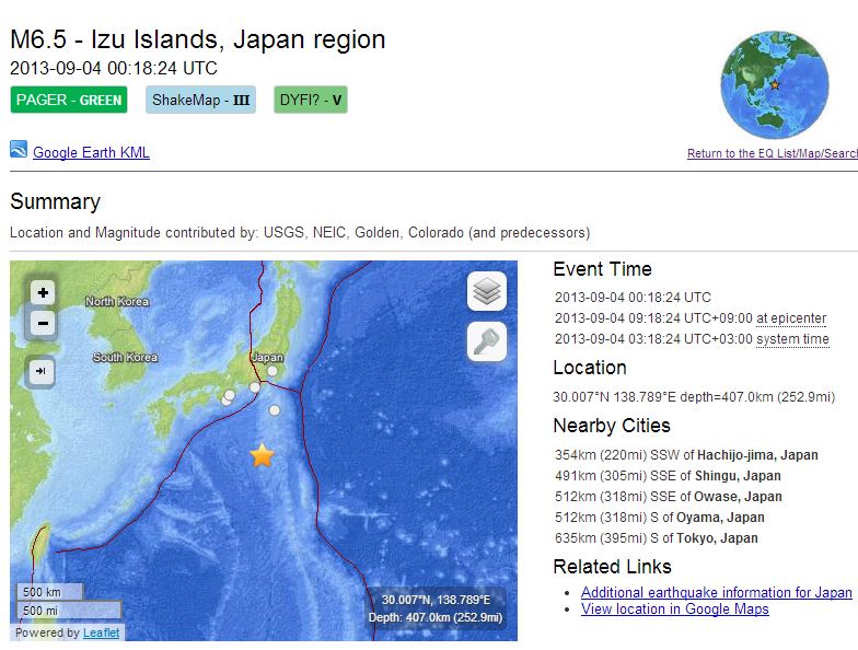 Το επίκεντρο της δόνησης εντοπίσθηκε σε απόσταση 580 χιλιομέτρων νότια της ιαπωνικής πρωτεύουσας και το εστιακό του βάθους ήταν στα 400 χιλιόμετρα από την επιφάνεια της θάλασσας.