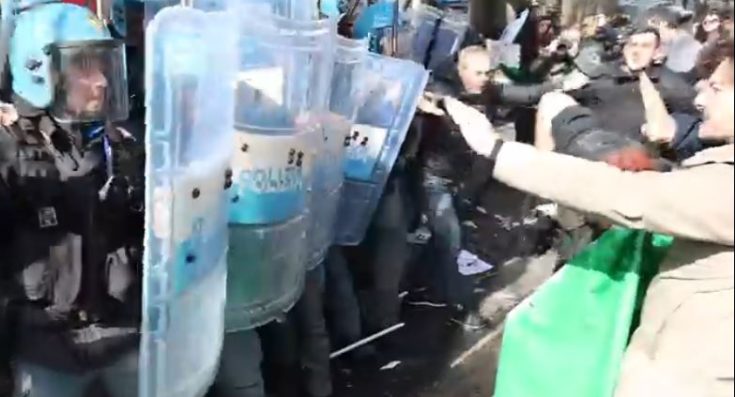 Η αστυνομία έκανε χρήση γκλοπ όταν οι διαδηλωτές προσπάθησαν να κρεμάσουν πανό, στην τοπική είσοδο της ιταλικής τηλεόρασης. Τραυματίσθηκαν πέντε διαδηλωτές και πέντε αστυνομικοί. Η κατάσταση των οποίων δεν κρίνεται ανησυχητική.