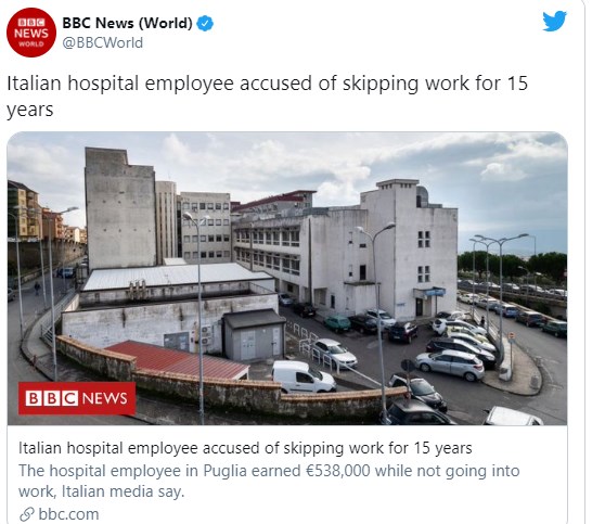 Η μία ημέρα ρεπό δεν ήταν αρκετή για τον 66χρονο Ιταλό, ο οποίος είχε να εμφανιστεί στη δουλειά του για 15 χρόνια. Ο άνδρας εργαζόταν σε νοσοκομείο στην Πούγκλια της Ιταλίας και κατηγορείται ότι πήρε συνολικά 537.000 ευρώ σε μισθούς χωρίς να παρέχει καμία υπηρεσία, σύμφωνα με την αστυνομία.