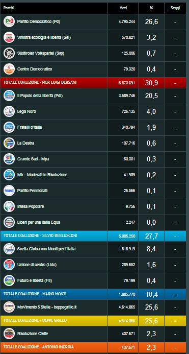 Συνεχείς ανατροπές παρατηρούνται στις Ιταλικές εκλογές. Ο συνασπισμός της κεντροαριστεράς, με επικεφαλής τον Πιερ Λουίτζι Μπερσάνι προηγείται στις βουλευτικές εκλογές με ποσοστό 30,9%, έναντι του συνασπισμού της κεντροδεξιάς με επικεφαλής τον Σίλβιο Μπερλουσκόνι που έπεται με 27,7%.