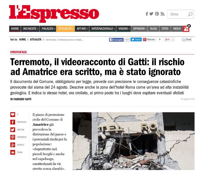 Το ιταλικό περιοδικό “L’Espresso” ρίχνει τις ευθύνες στη δημοτική αρχή του Αματρίτσε, του χωριού που ισοπεδώθηκε από τον σεισμό της 24ης Αυγούστου, όπου έχασαν τη ζωή τους 278 άνθρωποι.