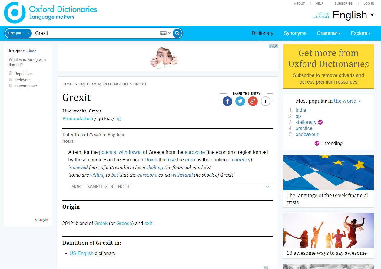 Μπορεί η Ελλάδα να μην βγήκε από την ευρωζώνη, το… Grexit όμως βρήκε τον τρόπο να μπει στο διαδικτυακό λεξικό της Οξφόρδης, έχοντας καλή παρέα: το επίσης μη γενόμενο Brexit, δηλαδή η έξοδος της Βρετανίας από την Ευρωπαϊκή Ένωση, και δεκάδες άλλους νεολογισμούς της αγγλικής γλώσσας.