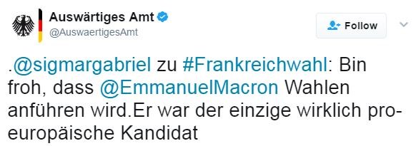 «Είμαι βέβαιος ότι θα καθαρίσει στον δεύτερο γύρο την άκρα δεξιά, τον λαϊκισμό της δεξιάς, τους αντιευρωπαίους», δήλωσε με μήνυμά του στο Twitter ο Ζίγκμαρ Γκάμπριελ.
