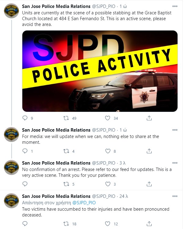 Δύο άνθρωποι σκοτώθηκαν και άλλοι τραυματίστηκαν σοβαρά την Κυριακή το βράδυ έπειτα από επίθεση με μαχαίρι στην εκκλησία Grace Baptist του Σαν Χοσέ στην Καλιφόρνια, ανέφεραν οι αρχές. Η αστυνομία του Σαν Χοσέ έκανε tweet στις 8:47 μ.μ. στο οποίο ανέφερε ότι οι αξιωματικοί ανταποκρίνονταν σε περιστατικό στην εκκλησία που βρίσκεται κοντά στην πανεπιστημιούπολη.