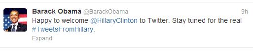 «Είμαι χαρούμενος να καλωσορίζω τη Χίλαρι στο twitter. Μείνετε συντονισμένοι για τα tweets της Χίλαρι»! Οσο για το λογαριασμό της Χίλαρι Κλίντον, αν και ακόμη δεν έχει μεγάλη δράση στο twitter, έχει ήδη περισσότερους από 250.000 followers.