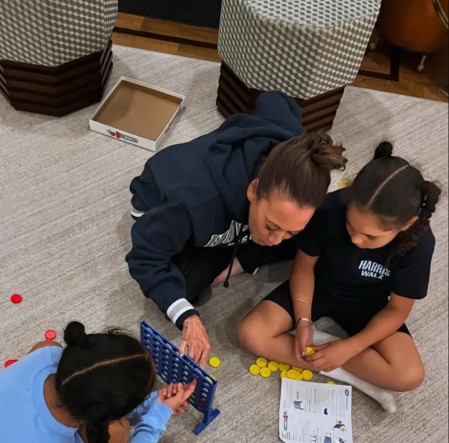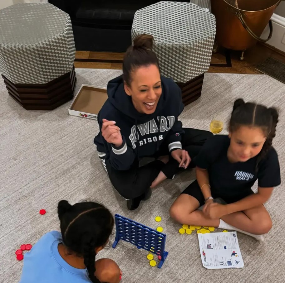 Στις εικόνες που δημοσίευσε η Μένα Χάρις, φαίνεται η αντιπρόεδρος των ΗΠΑ να παίζει με τις κόρες της ανιψιάς της και να πίνει λευκό κρασί. Η Κάμαλα Χάρις είναι ντυμένη αθλητικά και γελάει με τα μικρά κορίτσια καθώς παίζουν το επιτραπέζιο Connect 4.