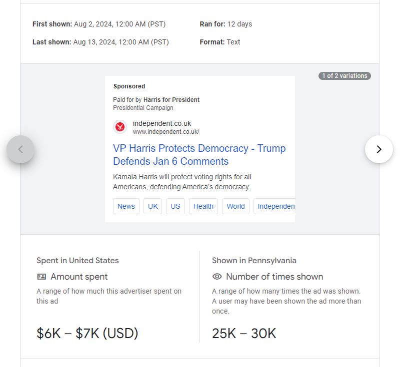 Σύμφωνα με το Kέντρο Διαφάνειας Διαφημίσεων της Google (Ads Transparency Center), η προεκλογική εκστρατεία του Ντόναλντ Τραμπ δεν προβάλλει τέτοιου είδους διαφημίσεις αυτή την περίοδο.