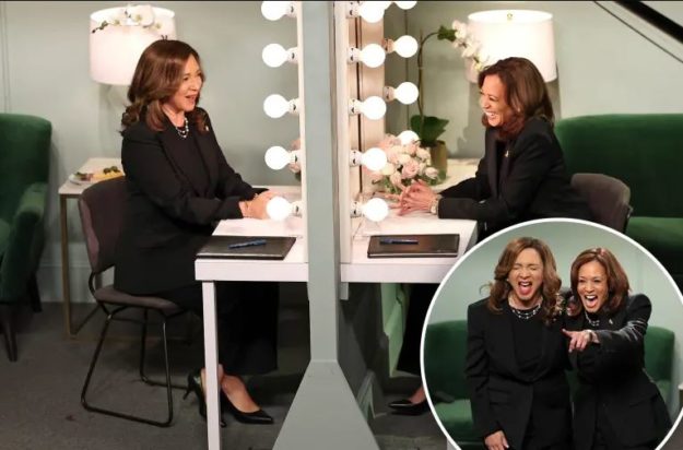 Η Κάμαλα Χάρις εμφανίστηκε μαζί με τη Μάγια Ρούντολφ, την ηθοποιό που την υποδύεται στο κωμικό σόου και μίλησε στον «εαυτό» της μέσω καθρέφτη, διακωμοδόντας τον αντίπαλό της, Ντόναλντ Τραμπ και την πρόσφατη φωτογράφιση του σε ένα απορριμματοφόρο, όπου παραλίγο να πέσει καθώς προσπαθούσε να μπει σε αυτό.