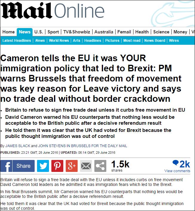 «Το Ηνωμένο Βασίλειο ψήφισε Brexit λόγω του προσφυγικού» υπογράμμισε στη συνέντευξη Τύπου μετά το τέλος της Συνόδου Κορυφής ο πρωθυπουργός της Βρετανίας, Ντέιβιντ Κάμερον, ο οποίος εν συνεχεία προειδοποίησε τους ομολόγους του ότι «τίποτα λιγότερο δεν θα γίνει αποδεκτό από το βρετανικό κοινό μετά το αποτέλεσμα του δημοψηφίσματος».