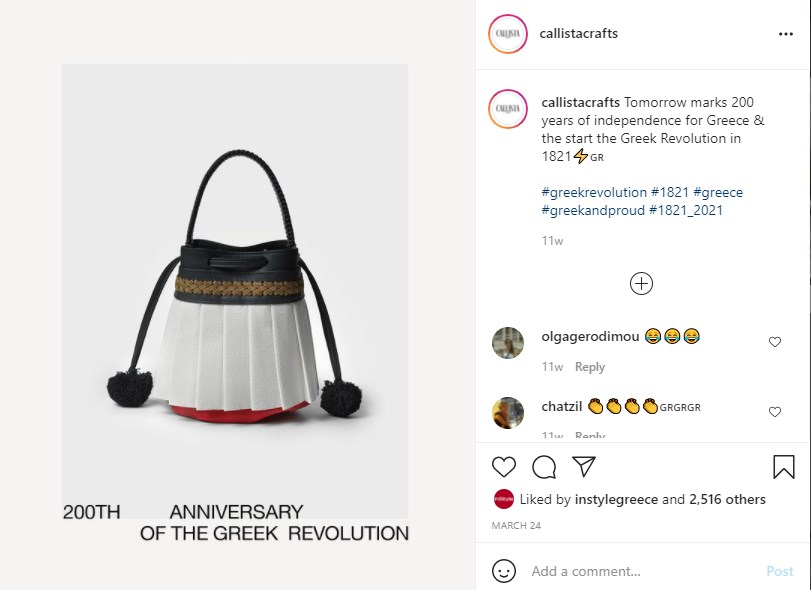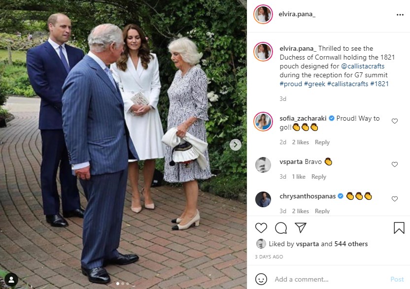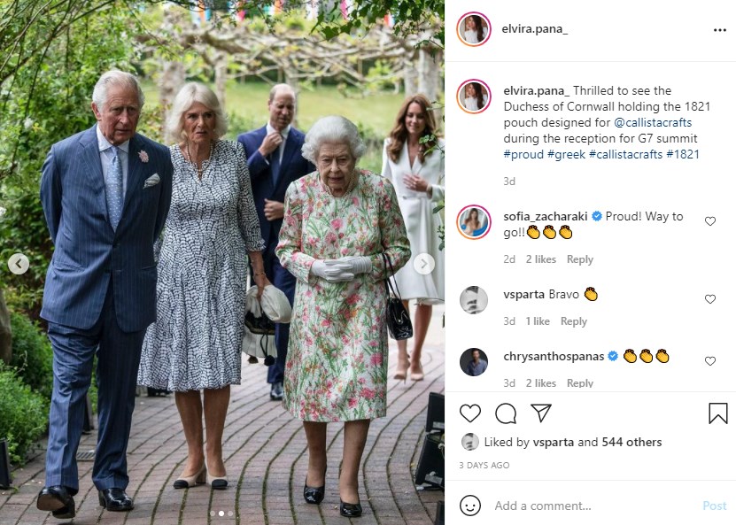 Η σχεδιάστρια της εταιρείας, Ελβίρα Παναγιωτοπούλου, σχολίασε την επιλογή της τσάντας από την Δούκισσα σε ανάρτηση στον λογαριασμό της στο Instagram.