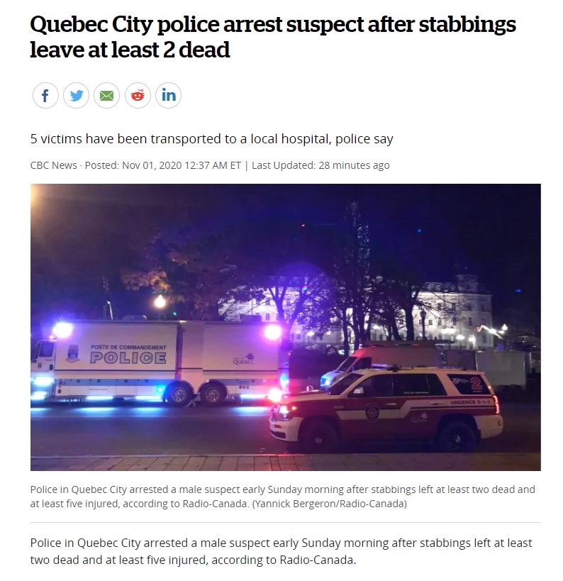 Τουλάχιστον δύο νεκροί και πολλοί τραυματίες στο Κεμπέκ του Καναδά έπειτα από επίθεση με μαχαίρι, όπως μεταδίσει το cbc.ca. Σύμφωνα με την καναδική αστυνομία ένας ύποπτος συνελήφθη. Το Radio-Canada αναφέρει ότι οι τραυματίες είναι τουλάχιστον πέντε και έχουν ήδη μεταφερθεί σε νοσοκομείο. Τα αίτια της επίθεσης δεν έχουν γίνει γνωστά. Ο εκπρόσωπος της αστυνομίαςμ Etienne Doyonμ έκανε λόγο για σοβαρή επίθεση που αναμένει να διευκρινιστεί γιατί έγινε. Οι πολίτες έχουν λάβει οδηγίες να παραμείνουν μέσα στα σπίτια τους.