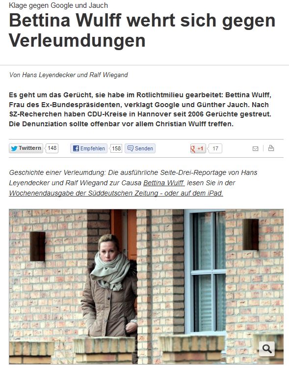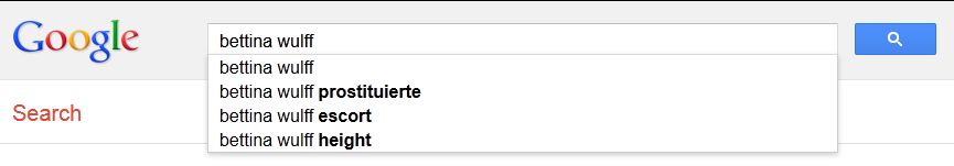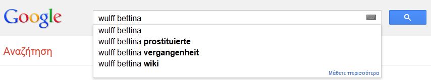Η Bettina Wulff, είναι η σύζυγος του πρώην Προέδρου της Γερμανίας, Christian Wulff, ο οποίος παραιτήθηκε όταν η εισαγγελία του Ανόβερου ζήτησε την άρση της ασυλίας του ώστε να διερευνηθεί σειρά από κατηγορίες εναντίον του για αποδοχή «αθέμιτων προνομίων».Τόσο η πρώην πρώτη κυρία της Γερμανίας, όσο και ο σύζυγός της, μηνύουν τώρα την Google για δυσφήμιση…Συγκεκριμένα, κάνοντας μια αναζήτηση στο Google.gr, για την Bettina Wulff, οι πρώτες επιλογές που εμφανίζει είναι “prostituierte” και “escort”, δηλαδή “εκδιδόμενη” και “συνοδός πολυτελείας”:
