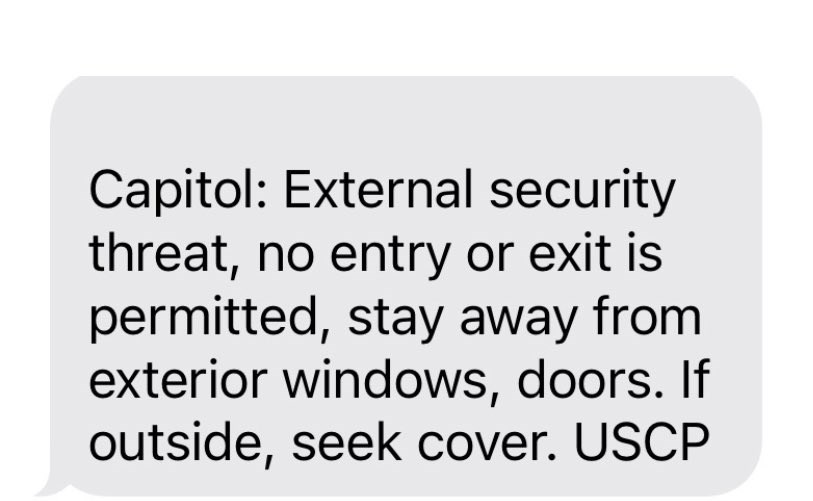 Αυτοκίνητο έπεσε πάνω σε φραγμό κοντά στο κτίριο του Καπιτωλίου. Ρεπόρτερ που κάλυπτε το ρεπορτάζ στη Γερουσία ανέβασε αντίγραφο από το μήνυμα που τους εστάλη καλώντας τους πάντες να μείνουν ασφαλείς μέσα στο κτίριο.