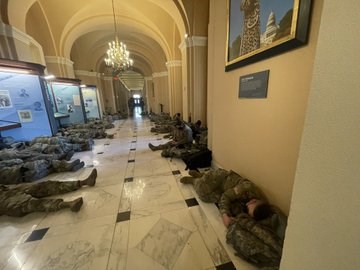 Ξαπλωμένοι στους διαδρόμους ή στις αίθουσες προσπαθώντας να ξεκουραστούν στον άοκνο αγώνα τους για την προστασία του Καπιτωλίου, του φάρου της Δημοκρατίας των ΗΠΑ, βρίσκονται εκατοντάδες στρατιώτες της Εθνοφρουράς.