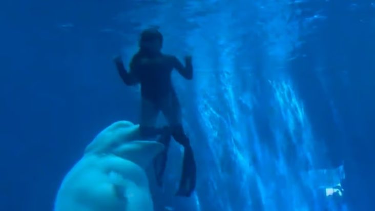 Όπως αναφέρει η Daily Mail, δραματικό βίντεο που κατέγραψαν παρευρισκόμενοι δείχνει την τεράστια φάλαινα μπελούγκα να κολυμπά με ταχύτητα προς μια δύτρια και να δαγκώνει τα πόδια της κάτω από το νερό.