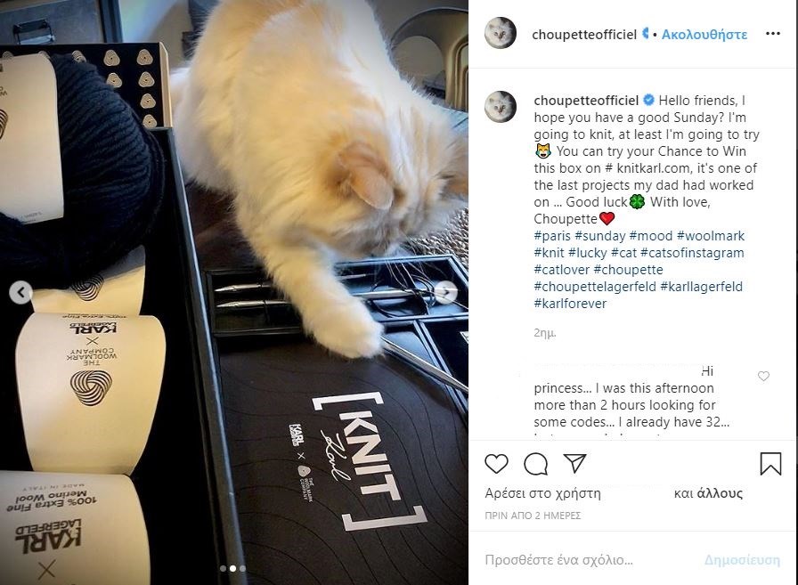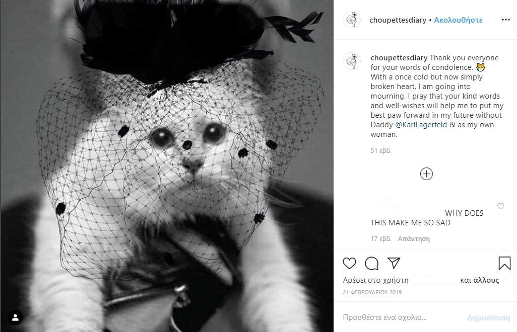 Με τον θάνατο του θρυλικού μόδιστρου, η ίδια η Σουπέτ φάνηκε να βυθίζεται στη θλίψη. Οι διαχειριστές του λογαριασμού της την έντυσαν με ένα μαύρο καπέλο με φτερά και βέλο. “Σας ευχαριστώ όλους για τα συλλυπητήριά σας. Με μία κρύα, μέχρι πρότινος, καρδιά και συντετριμμένη, θα πενθήσω. Προσεύχομαι ότι τα ευγενικά σας λόγια και οι ευχές σας θα με βοηθήσουν να προχωρήσω μπροστά χωρίς τον Μπαμπά μου Καρλ Λάγκερφελντ” αναφερόταν στη λεζάντα της φωτογραφίας.