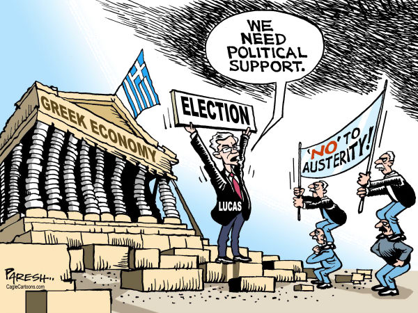 Τα πρώτα καρτούν για τις ελληνικές εκλογές αρχίζουν να εμφανίζονται στα διεθνή μέσα. Το πρώτο που βρήκαμε έρχεται από τα Cagle Cartoons και απεικονίζει τον Λουκά Παπαδήμο να ανακοινώνει τις εκλογές…