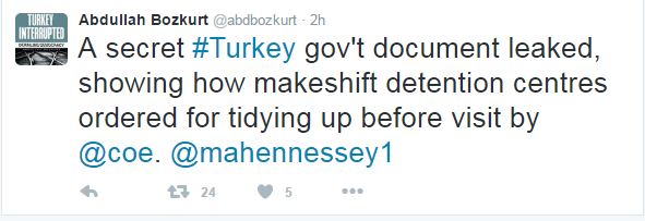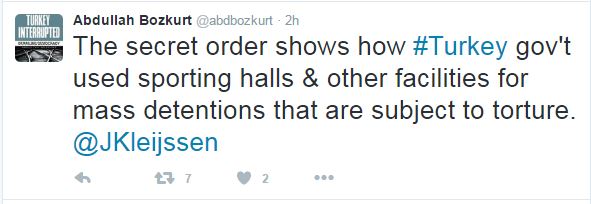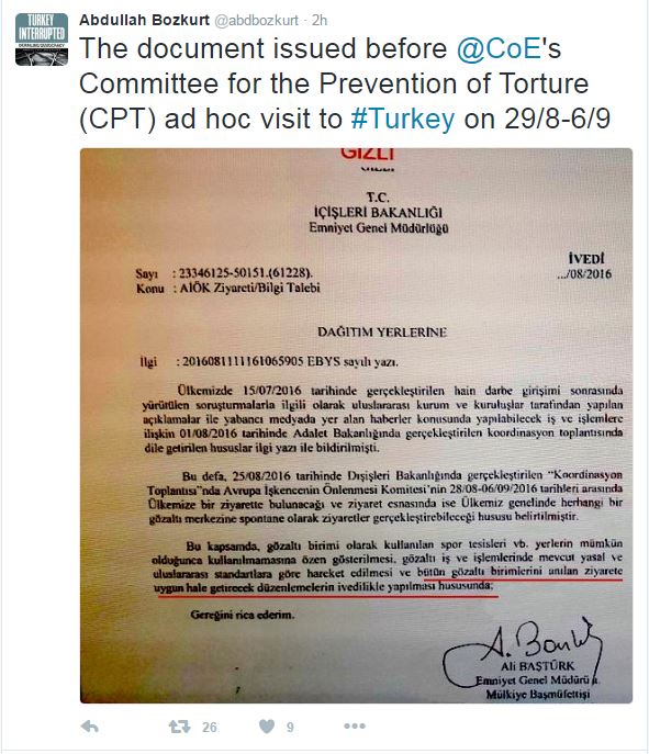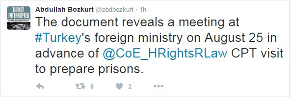 Ο δημοσιογράφος Abdullah Bozkurt καταγγέλλει ότι η τουρκική κυβέρνηση ζητούσε από τους αξιωματούχους ασφαλείας να εξαφανίσουν τα ίχνη βασανιστηρίων στα αυτοσχέδια κέντρα κράτησης από τη χώρα ενόψει της επίσκεψης αξιωματούχων του Συμβουλίου της Ευρώπης.