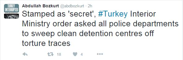 «Το σφραγισμένο ως μυστικό έγγραφο του υπουργείου Εσωτερικών ζητά από όλα τα αστυνομικά τμήματα να καθαρίσουν τα κρατητήρια από ίχνη βασανιστηρίων» αναφέρει σε ένα tweet και προσθέτει ότι «το έγγραφο εκδόθηκε πριν από την επίσκεψη του Συμβουλίου της Ευρώπης στην Τουρκία για την πρόληψη των βασανιστηρίων στις 29/8-6/9».