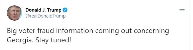 Αυτήν τη φορά υποστηρίζει ότι ανακαλύφθηκαν στην Τζόρτζια πληροφορίες για μεγάλη απάτη με τις ψήφους. “Έρχονται πληροφορίες για μεγάλη απάτη με τις ψήφους αναφορικά με την Τζόρτζια. Μείνετε συντονισμένοι” έγραψε ο Τραμπ σε ανάρτησή του στο twitter. Ο Μπάιντεν έχει κηρυχθεί νικητής στην Τζόρτζια έπειτα από μία καταμέτρηση ενώ παλαιότεροι ισχυρισμοί του Τραμπ για απάτη έχουν απορριφθεί.