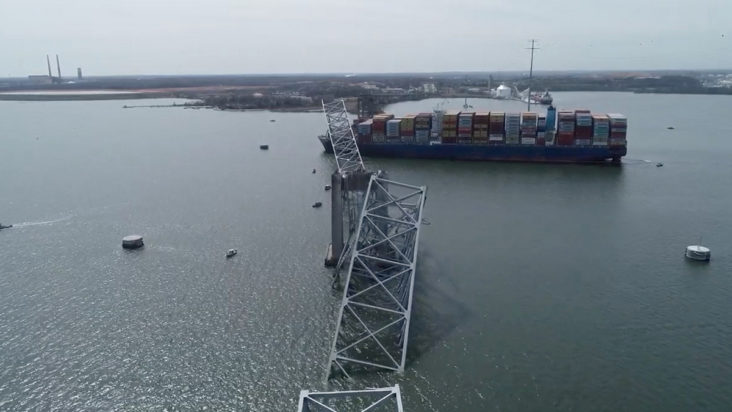 Εντυπωσιακές εικόνες από κλειστά κυκλώματα παρακολούθησης δείχνουν το πλοίο μεταφοράς εμπορευματοκιβωτίων να αποκλίνει από την πορεία του και να πέφτει σε πυλώνα της γέφυρας, που εγκαινιάστηκε το 1977, προκαλώντας την κατάρρευσή της.
