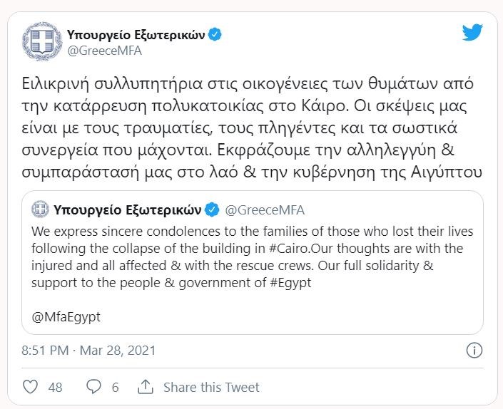 «Οι σκέψεις μας είναι με τους τραυματίες, τους πληγέντες και τα σωστικά συνεργεία που μάχονται» επισημαίνει το υπουργείο Εξωτερικών.