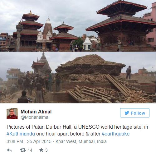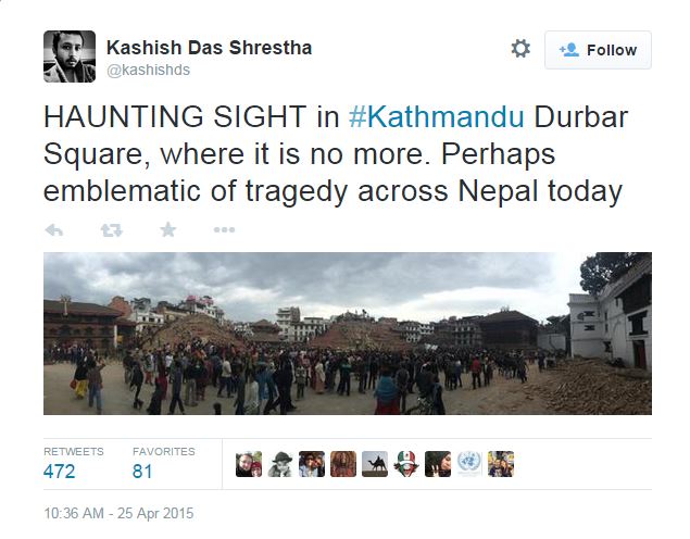 Στο Twitter οι Νεπαλέζοι εκφράζουν τη συντριβή τους. “Η Πλατεία Ντέρμπαρ δεν υπάρχει πια. Σύμβολο μάλλον της τραγωδίας που έπληξε σήμερα το Νεπάλ”, έγραψε ο @kashishds.