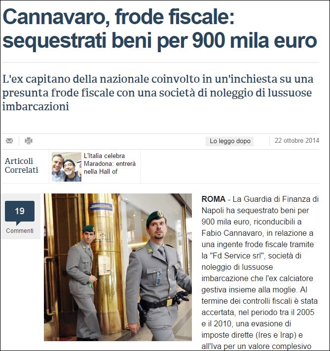 Σε κατάσχεση αγαθών ιδιοκτησίας του ποδοσφαιριστή Φάμπιο Καναβάρο, αξίας 900.000 ευρώ, προχώρησε η ιταλική οικονομική αστυνομία Guardia di Finanza.