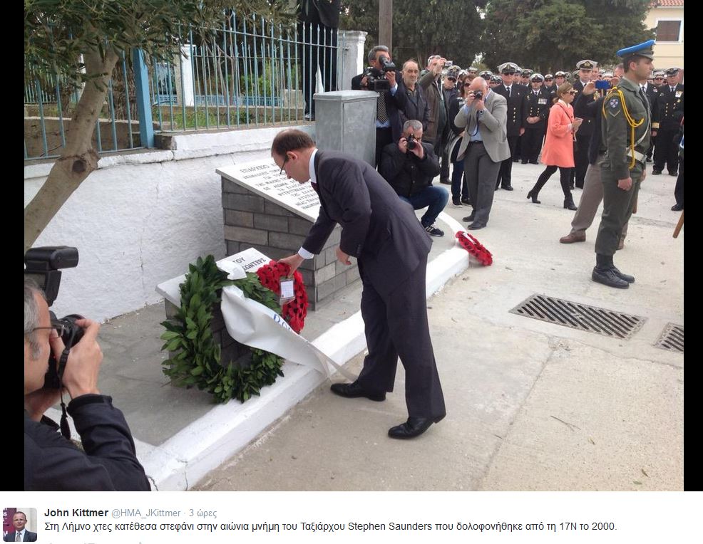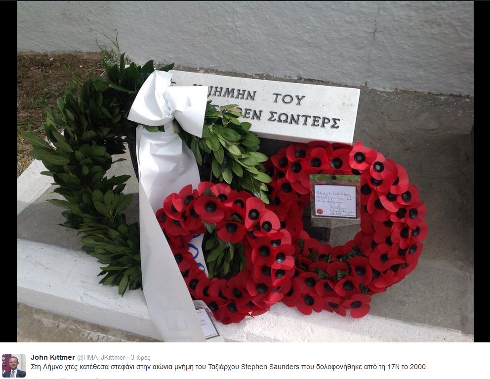 Ο Βρετανός πρέσβης στην Αθήνα, Τζον Κίμερ, πρόσφατα παρευρέθηκε στη Λήμνο για την εκδήλωση μνήμης στο Μούδρο και προχώρησε σε μια συμβολική κίνηση καταθέτοντας στεφάνι στη μνήμη του Βρετανού ταξιάρχου Στίβεν Σόντερς που δολοφονήθηκε από την οργάνωση «17 Νοέμβρη» το 2000.